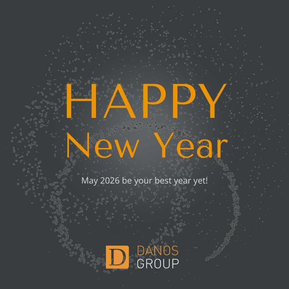 Dark background with festive fireworks, New Year greeting, and Danos Group logos—trusted leaders in governance and compliance recruitment.